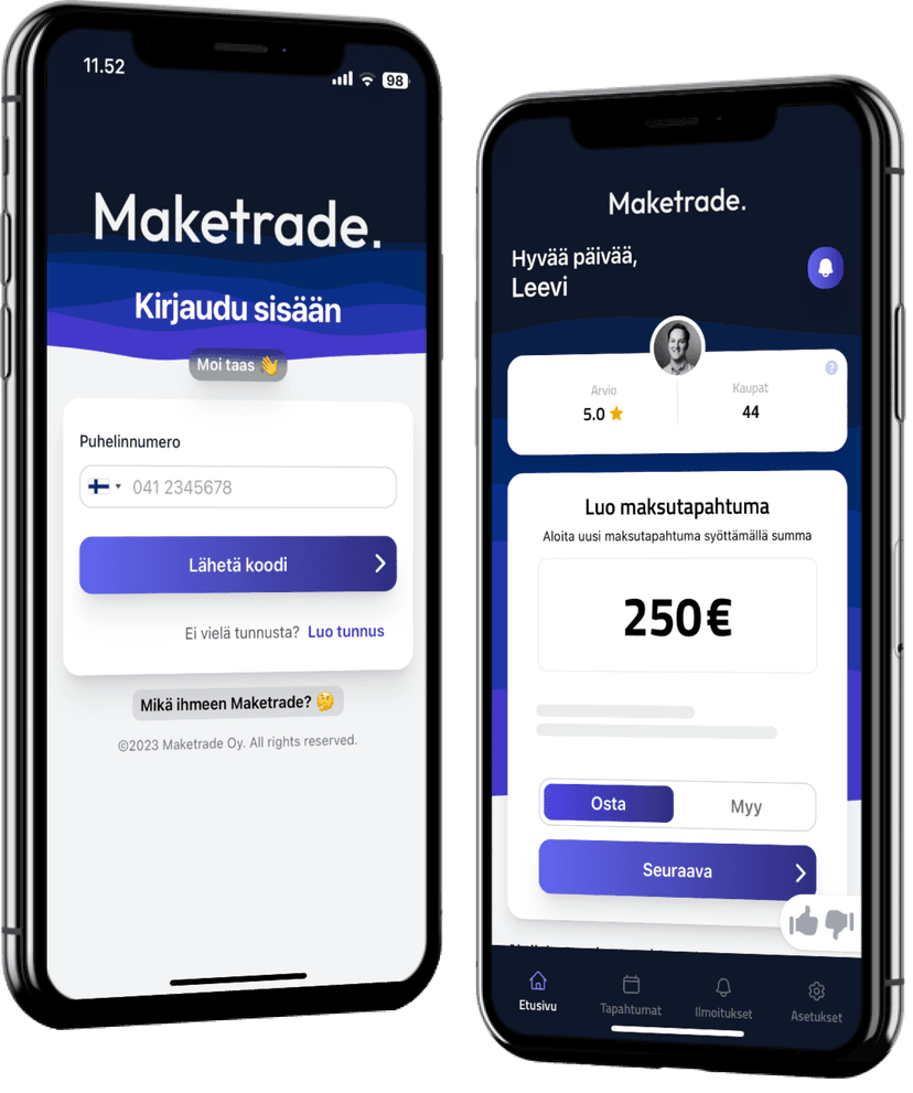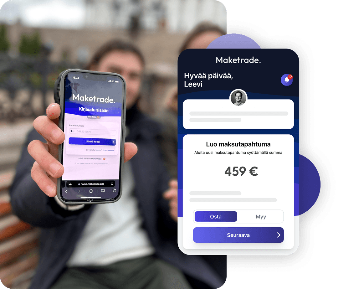 Maketraden avulla toisilleen tuntemattomat henkilöt voivat käydä turvallisesti kauppaa nettikirppiksillä, kuten Tori.fi:ssä tai Facebook Marketplacessa. Löydä etsimäsi tuote miltä vain markkinapaikalta, siirry Maketradeen ja kutsu kauppakumppani kätevästi mukaan kutsulinkillä viimeistelemään kaupat.